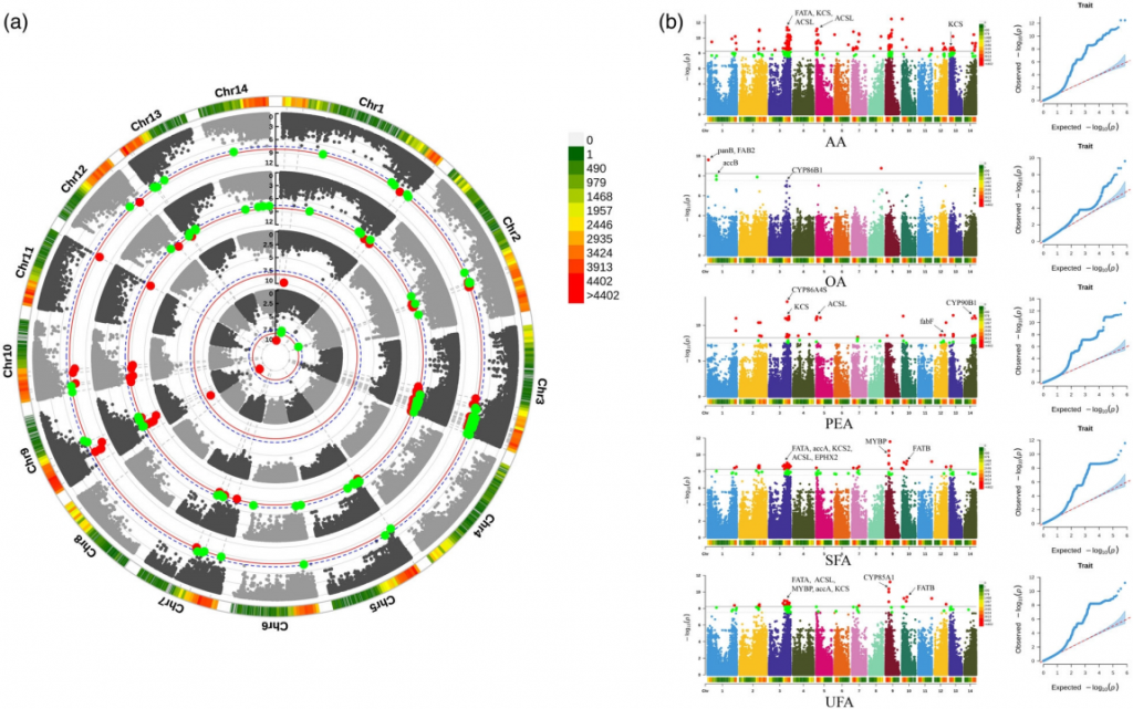 鎖定油脂合成關鍵位點:通過全基因組關聯(lián)分析(GWAS),團隊識別出影響種仁油脂組成的多個關鍵基因(如ACSL、FAD2、FAB2等),為高品質油料品種的選育提供了精準靶點。