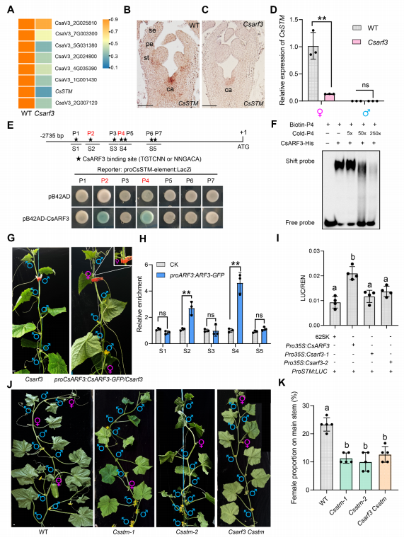 KNOX家族轉(zhuǎn)錄因子參與莖端分生組織(SAM)形成和心皮發(fā)育。研究發(fā)現(xiàn),Csarf3突變體異常心皮中多數(shù)KNOX?I類成員表達(dá)下調(diào),其中CsSTM(SHOOT?MERISTEMLESS同源基因)下降最為顯著(圖2A)。CsSTM在雌花芽中表達(dá)高于雄花芽,在Csarf3突變體莖尖中表達(dá)降低,而在CsARF3-OE株系中上調(diào)(圖2B-D)。酵母單雜交、凝膠遷移實(shí)驗(yàn)(EMSA)和染色質(zhì)免疫沉淀(ChIP-qPCR)證實(shí),CsARF3可直接結(jié)合CsSTM啟動(dòng)子中的生長素響應(yīng)元件(AuxREs),并激活其轉(zhuǎn)錄(圖2E-H,?I)。CsSTM在性別決定前特異性富集于雌花的心皮原基。敲除CsSTM導(dǎo)致雌花比例下降和首朵雌花出現(xiàn)延遲,而Csarf3?Csstm雙突變體的表型與Csstm單突變體相似,表明CsSTM位于CsARF3下游共同促進(jìn)雌花形成(圖2J,?K)。