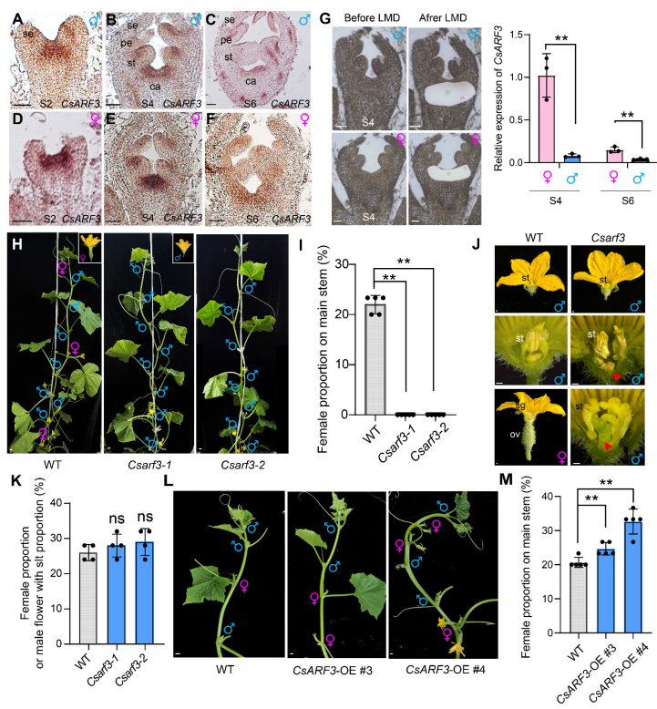 該研究首先發(fā)現(xiàn),外源施加生長素(IAA)可提高黃瓜雌雄花比例。在16個(gè)黃瓜ARF家族成員中,CsARF3在雌性系WI1983G的雌花芽中表達(dá)顯著高于其近等基因系WI1983GM(ACS1G突變,以雄花為主)的雄花芽,且在性別決定期(第6期之前)的表達(dá)更高(圖1A-G)。利用CRISPR/Cas9技術(shù)構(gòu)建的Csarf3移碼突變體(Csarf3-1和Csarf3-2)僅產(chǎn)生雄花,而野生型(WT)為雌雄同株(圖1H,?I)。突變體部分雄花在心皮殘留部位出現(xiàn)花柱樣組織,其比例與野生型的雌花比例相似,暗示Csarf3突變導(dǎo)致雌花向雄花轉(zhuǎn)化(圖1J,?K)。相反,CsARF3過表達(dá)株系(CsARF3-OE)的雌花比例和復(fù)合雌性(每節(jié)多雌花)比例均顯著增加(圖1L,?M)。外源IAA處理無法恢復(fù)Csarf3突變體的雌花產(chǎn)生,表明CsARF3介導(dǎo)的生長素信號是黃瓜雌花形成不可或缺的環(huán)節(jié)。