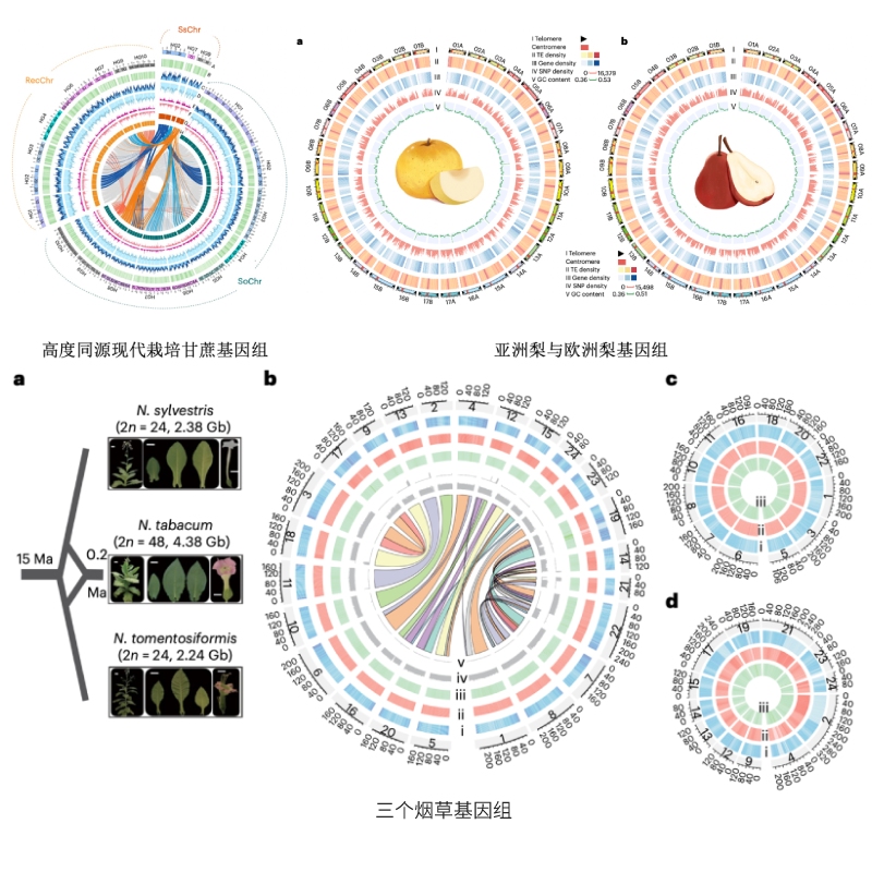 高質(zhì)量參考基因組是植物多組學(xué)研究的基石,其完整性、準(zhǔn)確性直接決定了重測(cè)序比對(duì)、轉(zhuǎn)錄組定量、代謝組關(guān)聯(lián)分析等下游研究的可靠性。盡管當(dāng)前植物基因組測(cè)序與組裝技術(shù)飛速發(fā)展,單仍存在某些亞種、品種、野生近緣種的基因組空缺。2025年相關(guān)研究成果顯著:1月3日,廣西大學(xué)亞熱帶農(nóng)業(yè)生物資源保護(hù)與利用國(guó)家重點(diǎn)實(shí)驗(yàn)室張積森團(tuán)隊(duì)解析了現(xiàn)代栽培甘蔗的復(fù)雜基因組,結(jié)合群體測(cè)序挖掘甘蔗糖份相關(guān)位點(diǎn);3月,通過(guò)3個(gè)煙草基因組+5,196份簡(jiǎn)化基因組測(cè)序,揭示重要模式植物基因組進(jìn)化與復(fù)雜性狀調(diào)控機(jī)制;8月,完成亞洲梨與歐洲梨高質(zhì)量基因組組裝,結(jié)合362份不同種質(zhì)重測(cè)序數(shù)據(jù),揭示亞洲梨和歐洲梨的演化歷史,開(kāi)展果實(shí)品質(zhì)相關(guān)SV-GWAS研究;11月,通過(guò)甜玉米基因組組裝,結(jié)合轉(zhuǎn)錄組、代謝組和功能驗(yàn)證的系統(tǒng)整合分析,全面揭示了甜玉米風(fēng)味形成的遺傳與分子機(jī)制。