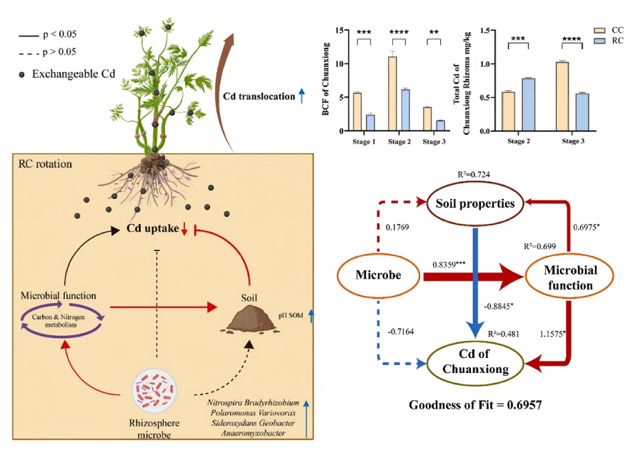 該研究采用多學(xué)科整合方法開展系統(tǒng)性探究:首先在四川鎘污染農(nóng)田設(shè)置?“稻?–?川芎輪作(RC)”?與?“川芎連作(CC)”?對照試驗,追蹤川芎全生育期生長指標(biāo);隨后通過HPLC測定活性成分、ICP-MS分析鎘含量、宏基因組解析根際微生物群落;結(jié)合土壤理化性質(zhì)檢測、酶活性分析,最終利用PLS-SEM模型構(gòu)建?“微生物?–?功能?–?土壤性質(zhì)?–?鎘積累”?調(diào)控網(wǎng)絡(luò)。研究發(fā)現(xiàn):