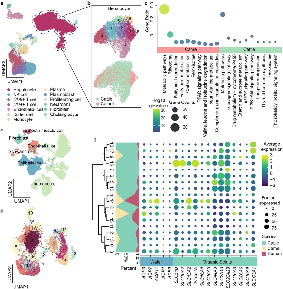 該研究構建了駱駝與牛的多組織單細胞轉錄組圖譜,并提供了駱駝腎臟的空間轉錄組數(shù)據,為解析物種特異性生物學特征及其進化歷程提供了重要資源?;谖?、腎臟及肝臟等關鍵消化代謝器官的跨物種比較,研究不僅驗證了駱駝胃部的起源假說,還揭示了特定細胞類型的基因表達變化如何幫助駱駝肝臟避免過度脂肪沉積。