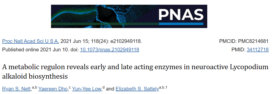 2021年6月,斯坦福大學 Elizabeth S. Sattely 團隊在國際頂尖學術期刊《美國國家科學院院刊》PNAS發(fā)表一項重要研究成果,題為:A metabolic regulon reveals early and late acting enzymes in neuroactive Lycopodium alkaloid biosynthesis。研究通過代謝組學和轉(zhuǎn)錄組學的方法,確定了一組發(fā)育受控的生物合成基因,或潛在的調(diào)節(jié)子,用于調(diào)控石松生物堿的生物合成。