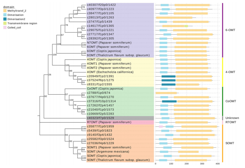 進一步研究發(fā)現(xiàn),其中參與合成具有廣泛臨床鎮(zhèn)痛潛力的關(guān)鍵代謝物四氫巴馬汀的酶可能與唯一已知的黃連中負(fù)責(zé)催化這一步反應(yīng)的ColumbamineO-methyltransferase(CoOMT)存在較大的蛋白質(zhì)序列差異。通過系統(tǒng)發(fā)生樹分析,作者們推斷出至少存在10種unigenes的翻譯產(chǎn)物可能催化四氫巴馬汀的合成。 特異性的氧甲基化是四氫巴馬汀與紫堇達明合成的關(guān)鍵,延胡索中是否存在特殊的一類OMT或者具有不同底物特異性的OMT則是接下來將要重點解析的重點。