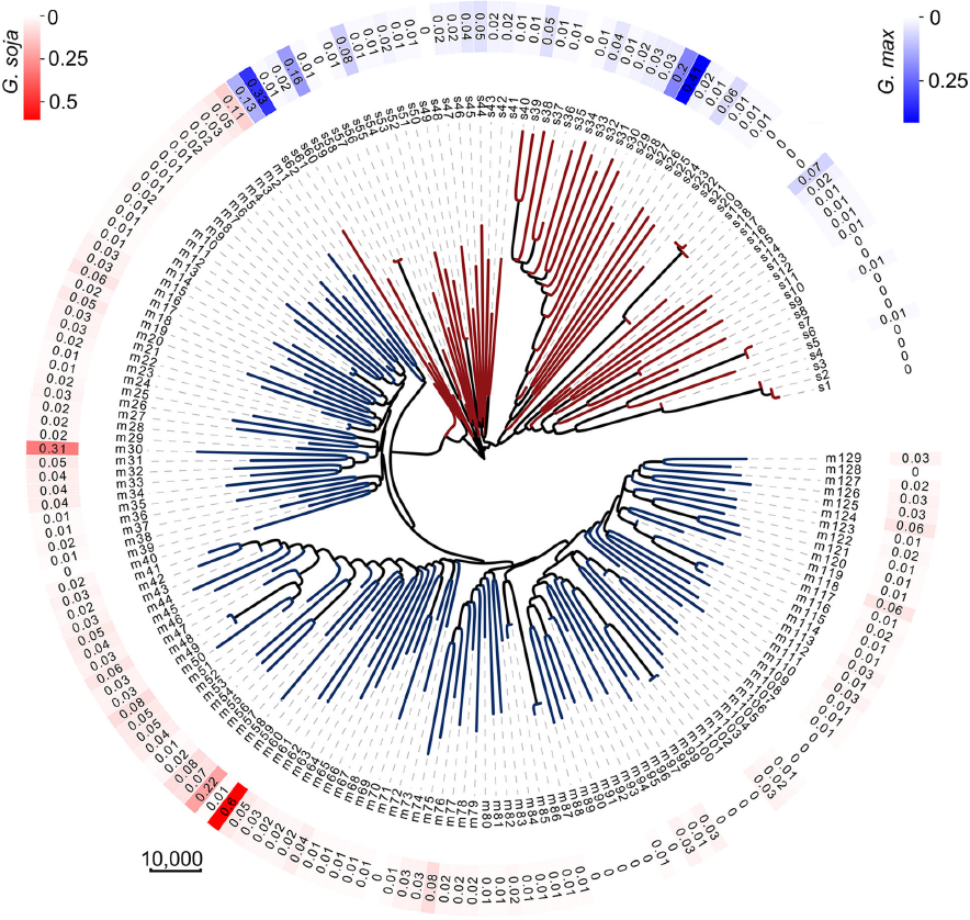 根據(jù)基因序列分析,PI 578357和黑河小黃豆之間及PI 339734和PI 407275之間的分歧時(shí)間分別可追溯到約0.37和27萬年前(mya)。由于大豆的馴化發(fā)生在大約6000-9000年前,兩對(野生大豆-栽培大豆)品種之間所檢查的滲入?yún)^(qū)域的如此高的相似性應(yīng)被視為野生大豆-栽培大豆?jié)B入的直接證據(jù)。