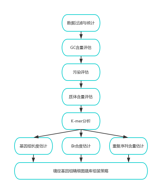 雙端測序數(shù)據(jù)通過評估雙端測序數(shù)據(jù)通過評估(GC分布統(tǒng)計、質(zhì)量值Q20、Q30評估)、過濾后得到高質(zhì)量的數(shù)據(jù)(clean reads),用于基因組大小的評估、基因組的組裝、GC含量的統(tǒng)計、雜合率的統(tǒng)計(以及組裝后的評估)。具體信息分析流程見圖2。