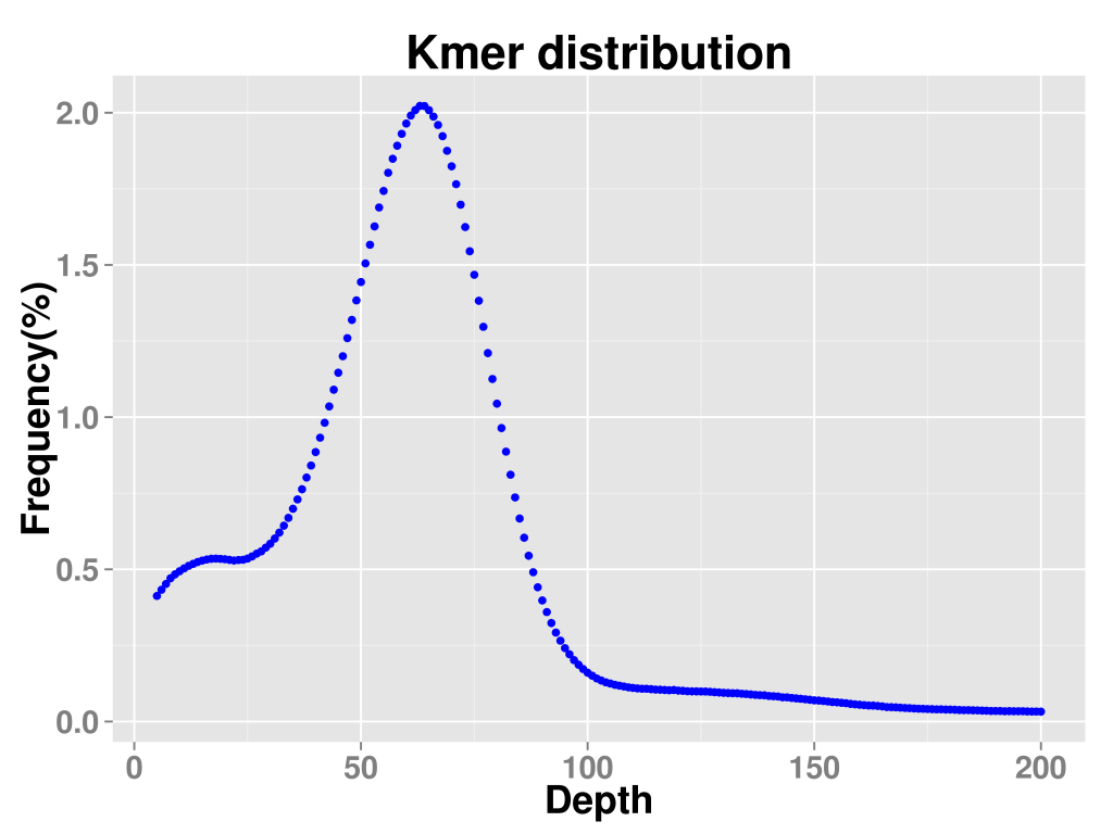 由于基因組存在雜合位點和重復序列,k-mer曲線往往不會呈現(xiàn)出良好的泊松分布,而是在主峰前后出現(xiàn)其他的峰,如果存在一定雜合度,會導致在主峰對應的橫坐標的二分之一處出現(xiàn)雜合峰,而一定的重復度則會在主峰對應的橫坐標的整數(shù)倍處出現(xiàn)重復峰。