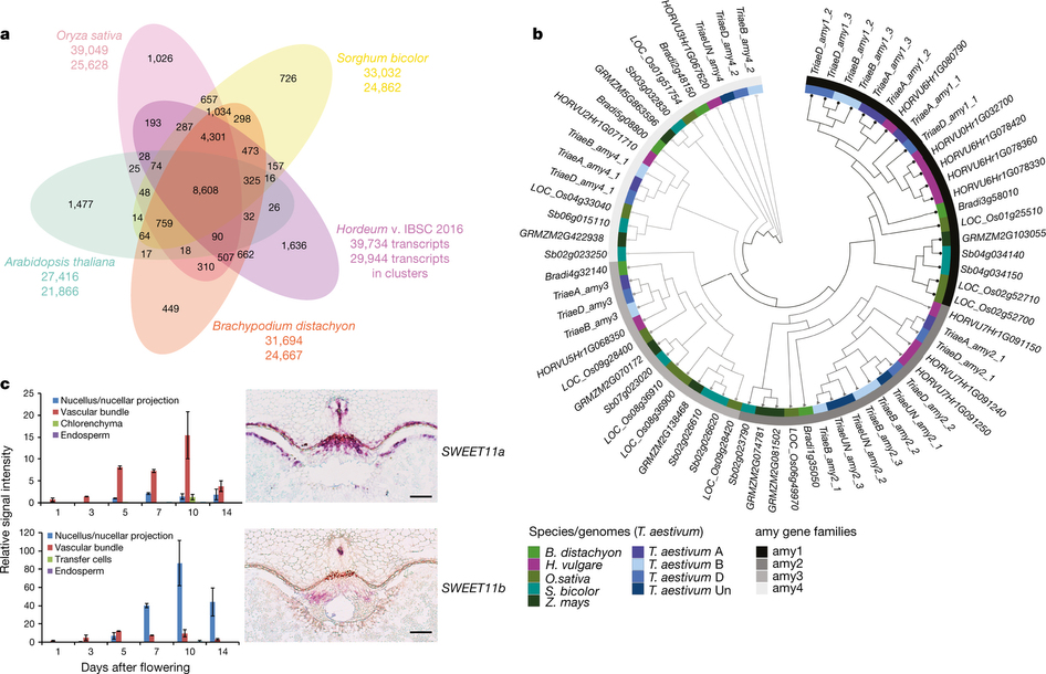 通過對大麥基因組進(jìn)行基因家族收縮擴(kuò)張分析發(fā)現(xiàn),收縮擴(kuò)張的家族中*顯著的部分都與植物防御及抗病相關(guān)。另外,作者對麥芽品質(zhì)相關(guān)的amy家族及糖代謝相關(guān)的SWEET家族進(jìn)行了亞家族分類,多倍化及表達(dá)模式相關(guān)的分析。
